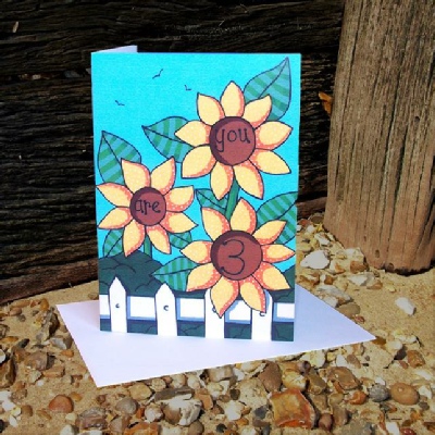 The Simply Country Range “Third Birthday Sunflowers” greetings card is created from an original acrylic on canvas painting by Olivia, which has been scanned and digitally enhance into a greetings card. The card measures approximately 12.5 cm x 17.5 cm and comes cello wrapped with a colour coordinated envelop. The inside of the card has been left blank for your own message.