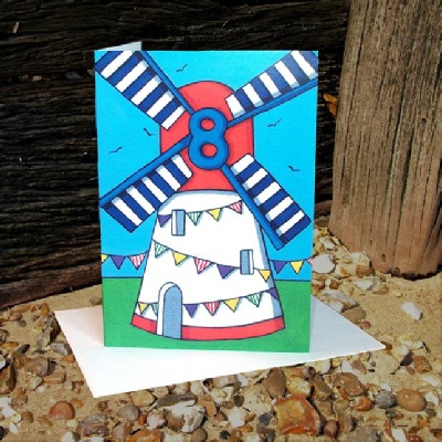 The Simply Country Range “Eighth Birthday Windmill” greetings card is created from an original acrylic on canvas painting by Olivia, which has been scanned and digitally enhance into a greetings card. The card measures approximately 12.5 cm x 17.5 cm and comes cello wrapped with a colour coordinated envelop. The inside of the card has been left blank for your own message.